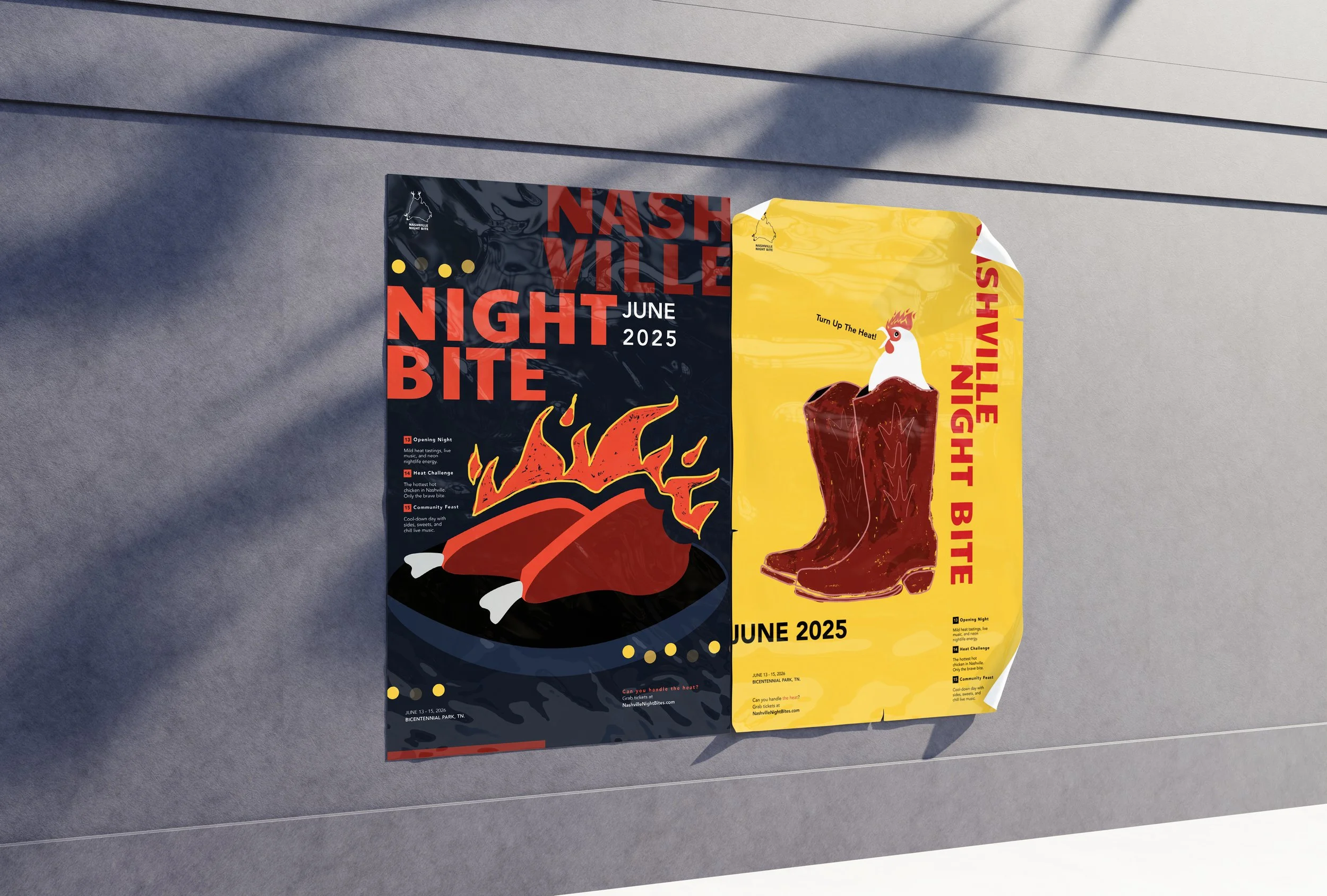 Nashville Night Bites was conceived as a fictional three-day festival that celebrates this iconic dish after dark, drawing inspiration from the city’s neon signage, nighttime energy, and shared food experiences. The goal of the project was to create a cohesive visual identity system that feels unmistakably Nashville while remaining bold, playful, and contemporary.